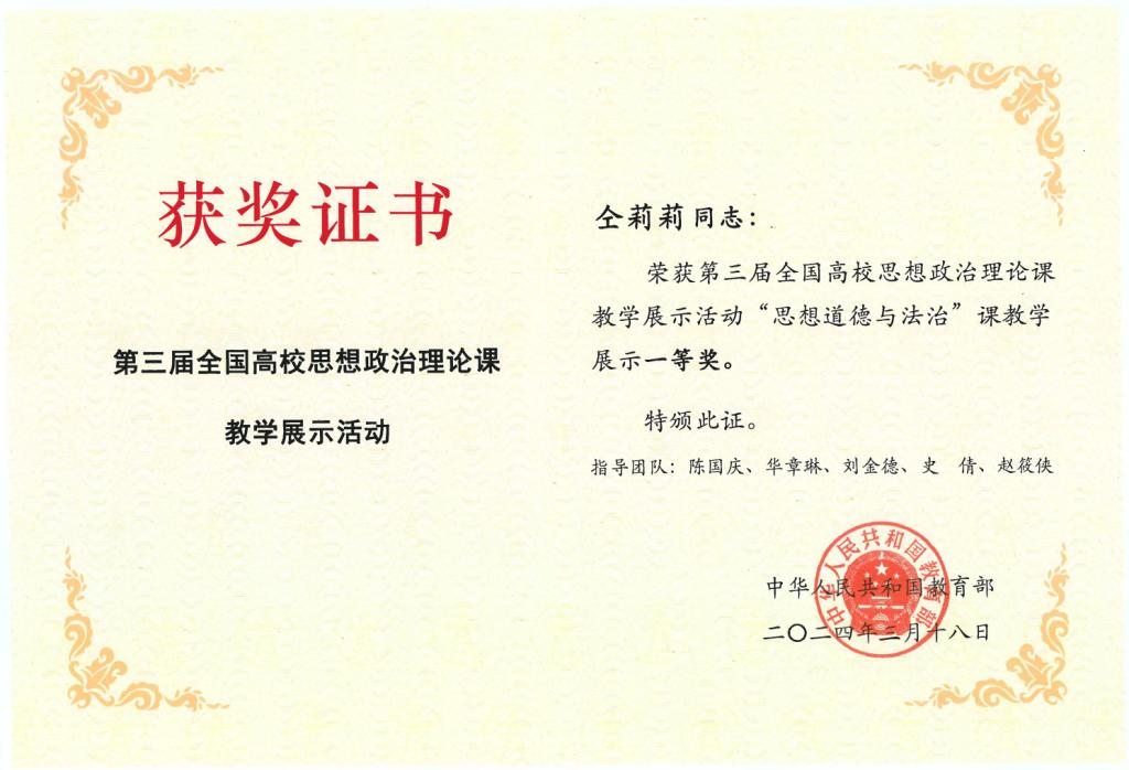 近期,教育部公示第三届全国高校思想政治理论课教学展示活动“教学竞赛单元”评审结果,马克思主义学院仝莉莉老师获“思想道德与法治”课教学展示一等奖。
