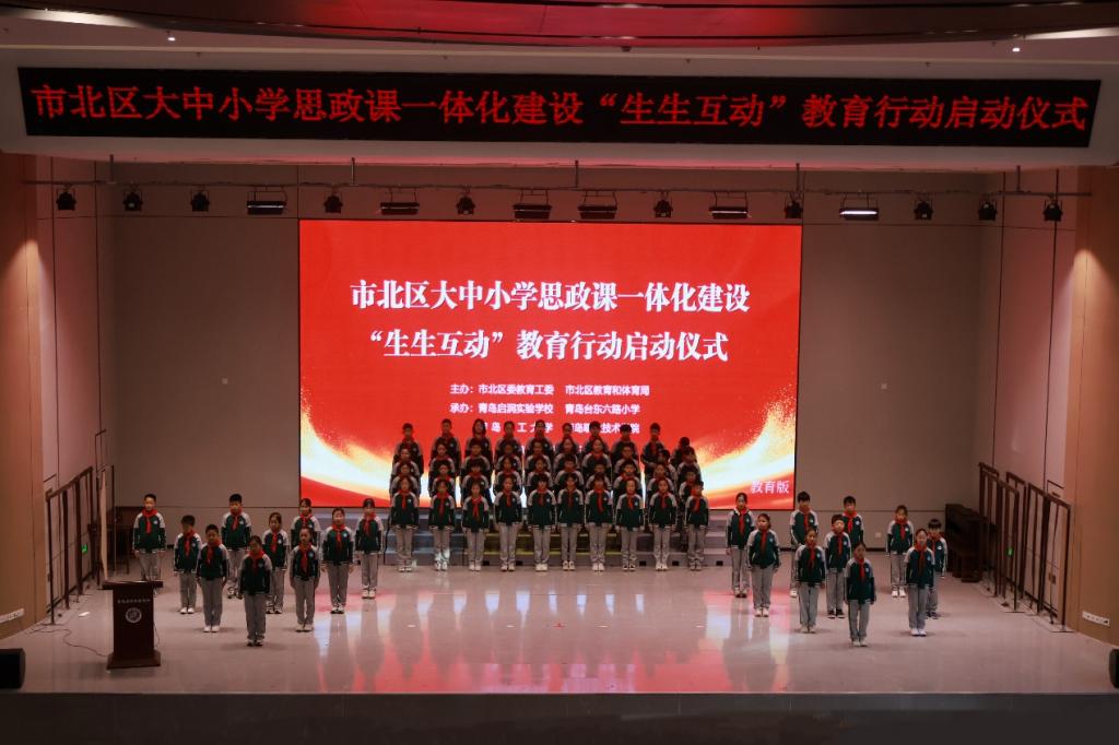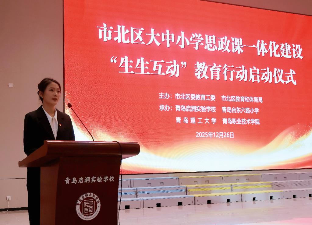 为切实整合青岛市各学段思政教育优质资源,深入推进我市大中小学思想政治教育一体化建设,12月26日下午,ylzz总站线路检测中心马克思主义学院协同青岛职业技术学院、青岛启润实验学校、青岛台东六路小学,在市北区教育和体育局的精心组织下,共同举办了市北区大中小学思政课一体化建设“生生互动”教育行动启动仪式。青岛市教育局思想政治与德育工作处二级调研员孙建中,市北区教育和体育局党组成员、副局长翟春燕,ylzz总站线路检测中心马克思主义学院院长华章琳、院长助理王鹏,青岛职业技术学院马克思主义学院副院长王洪娇等有关部门领导出席本次活动。