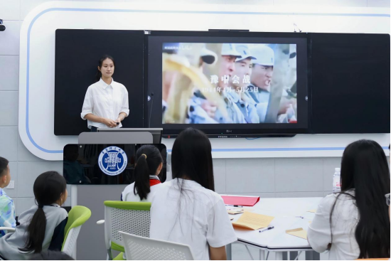 “抗战是我们伟大的母亲,她正在产生新的中国、新的民族、新的人民。”“我们要在战争环境中受到锻炼,我们要在敌人的炮火下壮大起来。”一句句家书誓言的领读,正式拉开了思政课的帷幕。思政课聚焦抗战英雄王孝慈的英勇事迹,通过分学段领读、事迹讲解、互动分享等形式,共同感受抗战精神穿越时空、叩击心灵的力量。学生们在领读环节后纷纷表示:“革命英雄即便与家人天各一方,字里行间仍是国家安危重于泰山的坚定信念令人动容。”
