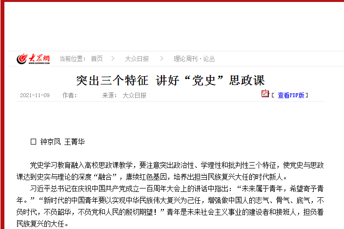 文章指出,党史学习教育融入高校思政课教学,要注意突出政治性、学理性和批判性三个特征,使党史与思政课达到史实与理论的深度“融合”,赓续红色基因,培养出担当民族复兴大任的时代新人。