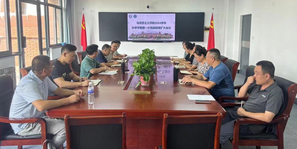 8月25日上午,马克思主义学院在主教学楼A310会议室召开了2024学年秋季学期第一次党政联席扩大会议。会议由党总支书记陈国庆主持,党总支委员参加会议,各教研室主任及党政办相关人员列席会议。