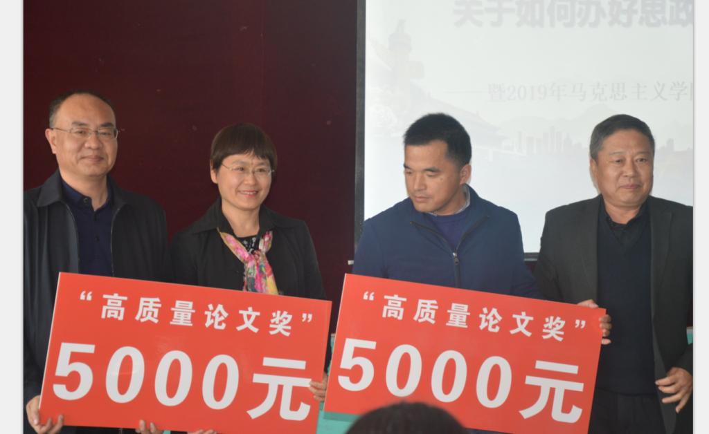 (学校党委常委、党委宣传部部长陈伟、马克思主义学院党总支书记王菁华为获得2018年”高质量论文奖”的教师颁奖)