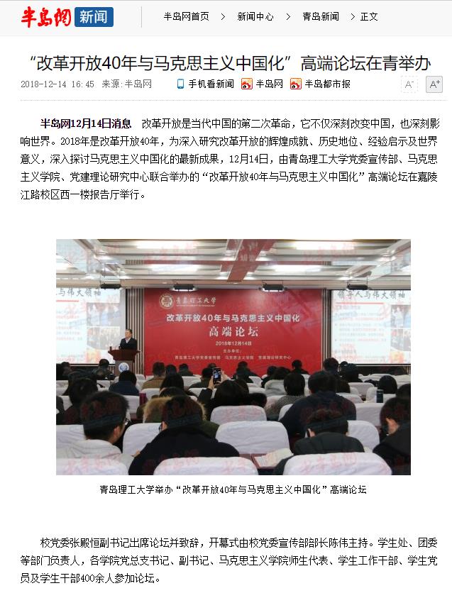 半岛网12月14日消息 改革开放是当代中国的第二次革命,它不仅深刻改变中国,也深刻影响世界。2018年是改革开放40年,为深入研究改革开放的辉煌成就、历史地位、经验启示及世界意义,深入探讨马克思主义中国化的最新成果,12月14日,由ylzz总站线路检测中心党委宣传部、马克思主义学院、党建理论研究中心联合举办的“改革开放40年与马克思主义中国化”高端论坛在嘉陵江路校区西一楼报告厅举行。