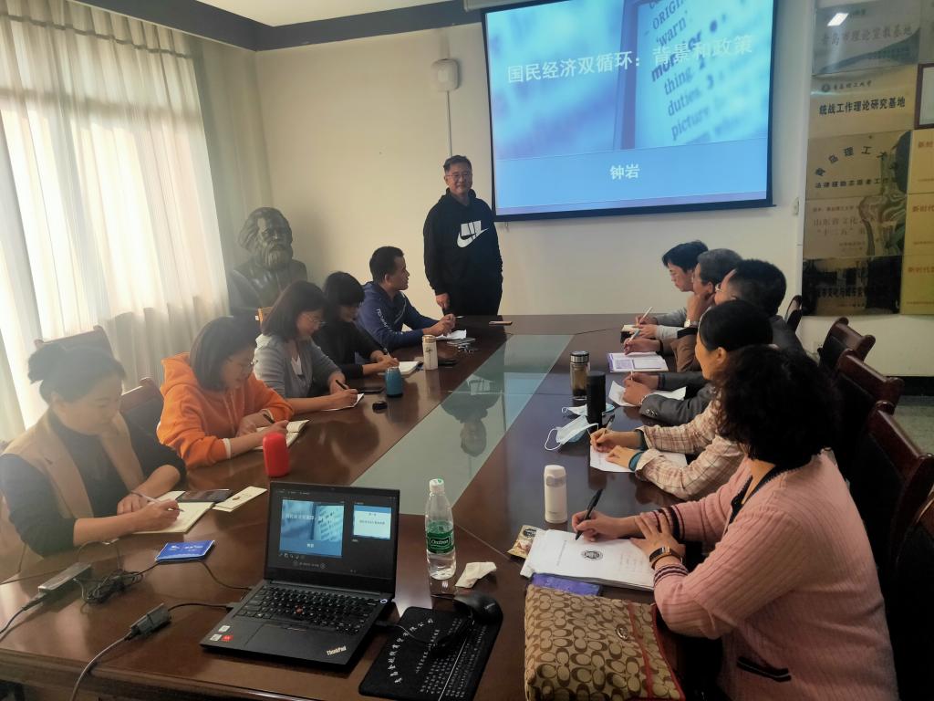 10月21日下午,马克思主义中国化教研室在学院会议室举行集体备课学习活动,钟岩老师以《国民经济双循环:背景与政策》为题,对“双循环”新发展格局进行了深入解读。华章琳副院长出席了活动。