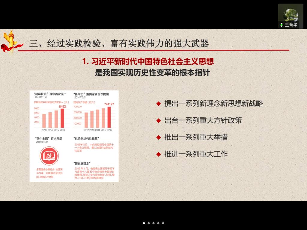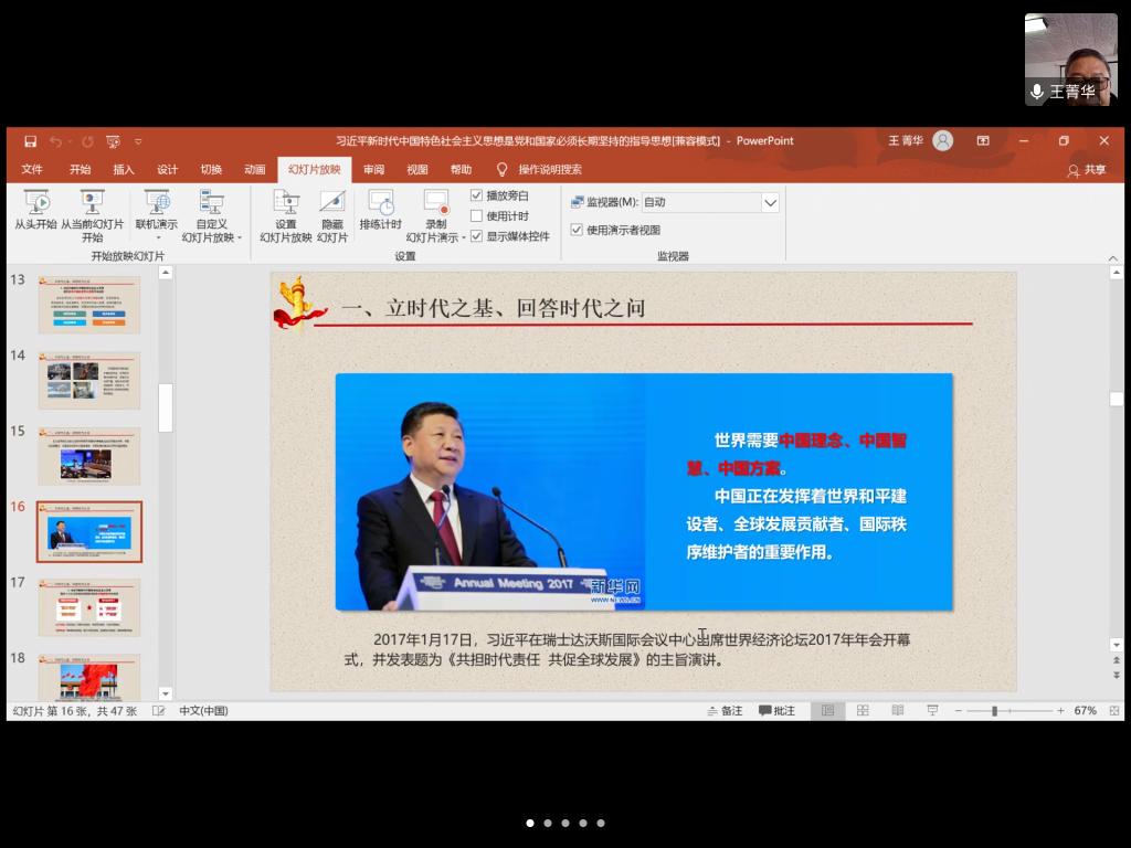 经过前期精心准备,马克思主义学院选择性必修课《习近平新时代中国特色社会主义思想概论》于4月22日如期开讲,马克思主义学院党总支书记王菁华教授通过腾讯会议方式为19级马克思主义中国化方向硕士研究生开讲第一专题:“习近平新时代中国特色社会主义思想的基本内涵与历史地位”。王菁华教授着重从“习近平新时代中国特色社会主义思想”的基本内涵、主要内容、基本特点与历史意义等四个方面给研究生全方位地解读了“习近平新时代中国特色社会主义思想”的整体组成。
