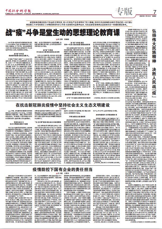 此次刊发的理论文章分别为李龙强、张婉婉的《战“疫”斗争是堂生动的思想理论教育课》,任颖卮的《弘扬伟大民族精神 决胜人民战“疫”》,李桂丽的《在抗击新冠肺炎疫情中坚持社会主义生态文明建设》,王玉喜、王菁华的《疫情防控下国有企业的责任担当》。