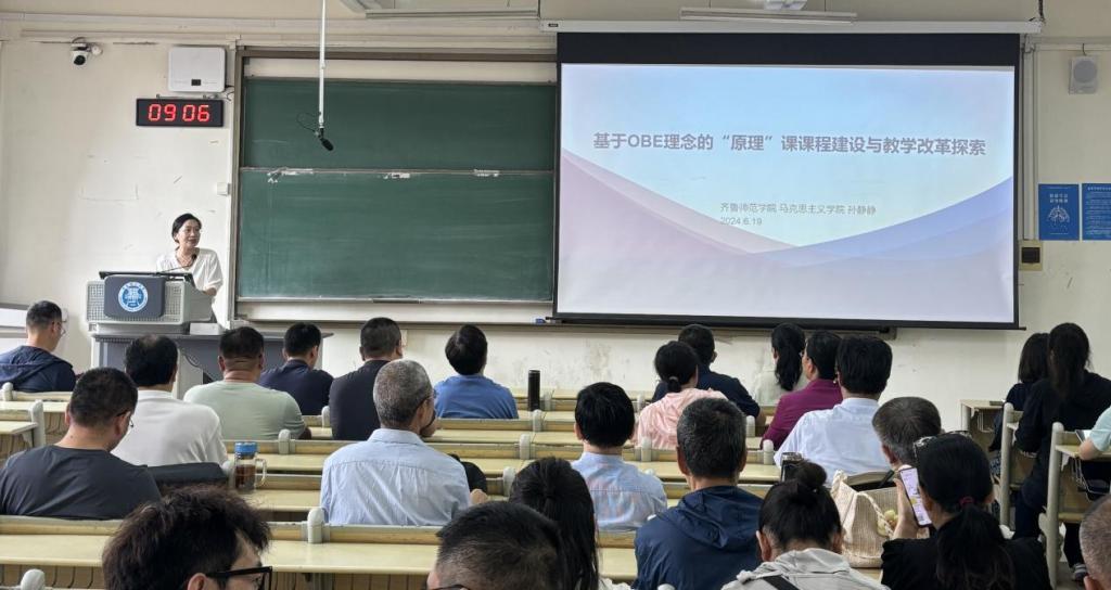 为进一步推进混合式教学改革,更好地加强思政课程建设质量、拓宽思政课发展深度,6月19日上午,我院邀请齐鲁师范学院马克思主义学院马克思主义基本原理课教研室主任孙静静副教授作专题讲座,讲座主题为“基于OBE理念的‘原理’课课程建设与教学改革探索”。本次讲座由马克思主义学院院长助理石峰主持,学院全体教师参加。