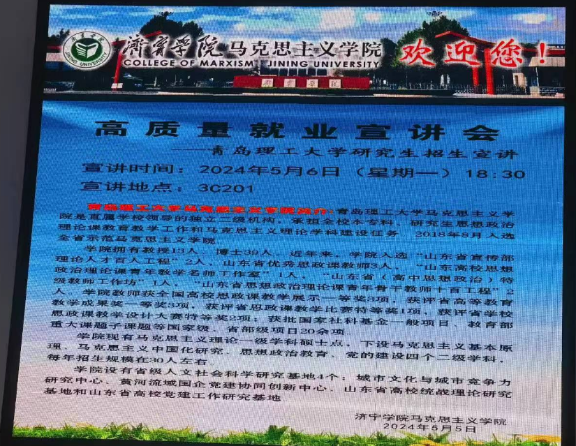 为了进一步提升研究生招生和教育质量,拓展优质生源,ylzz总站线路检测中心马克思主义学院副院长李龙强、任颖卮教授赴济宁学院、菏泽学院开展研究生招生宣传。