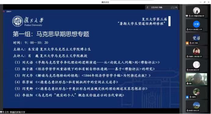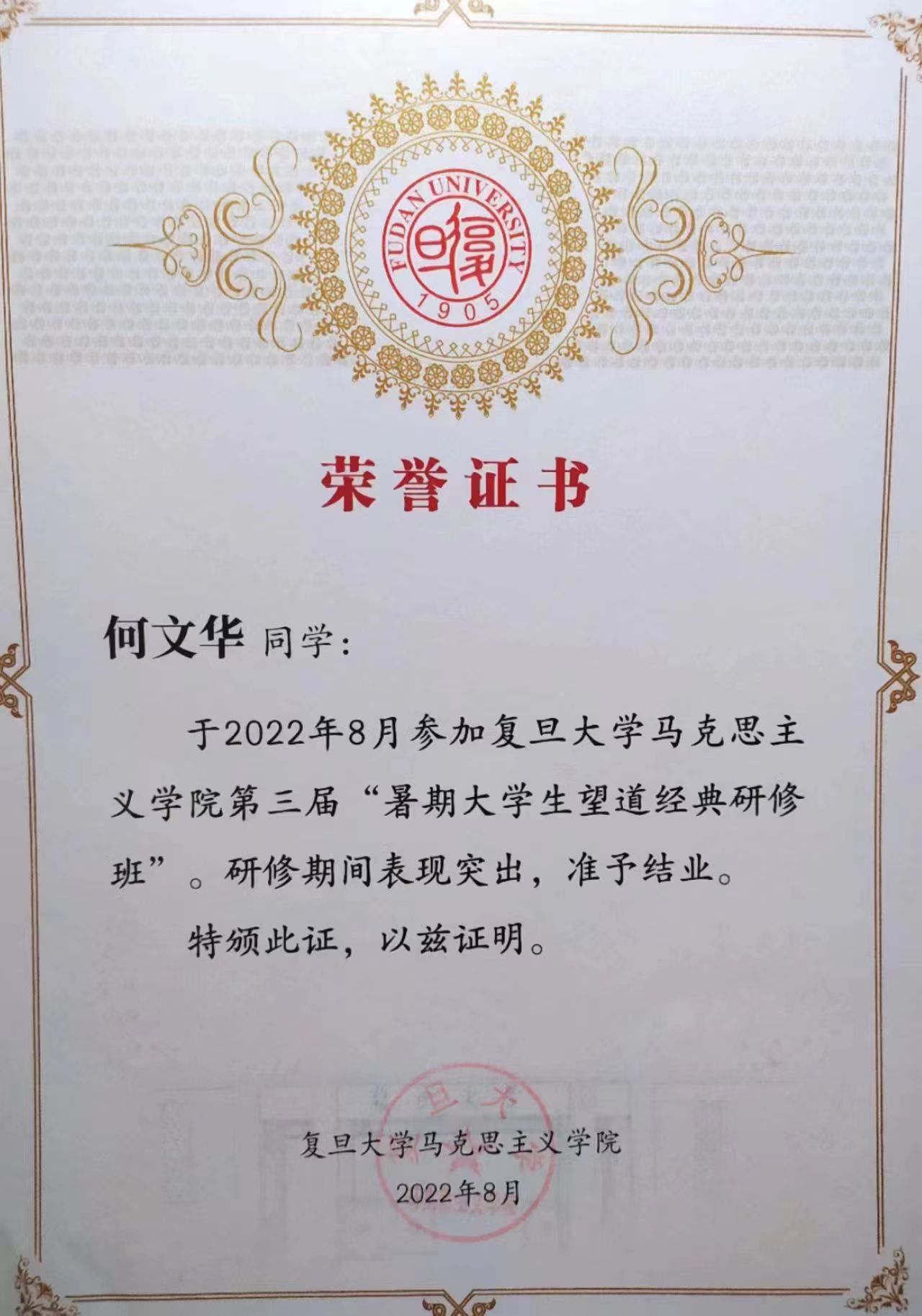 为鼓励深入研究当代中国马克思主义、21世纪马克思主义,鼓励大学生阅读和研究马克思主义经典著作,复旦大学马克思主义学院于2022年8月12日举办了第三届“暑期大学生望道经典研修班”。来自全国各高校、科研院所、党校系统的167名学生向研修班递交了论文,经过两轮专家评审,共有来自清华大学、北京大学、中国人民大学、上海交通大学、复旦大学等全国19所院校的22位学生入选,我院2021级研究生何文华同学(导师华章琳教授)入选研修班。