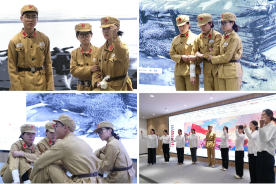 “不相信有完不成的任务,不相信有克服不了的困难,不相信有战胜不了的敌人!”随后,马克思主义学院青·理宣讲团成员身着黄绿色志愿军军装登场,通过“宣讲+话剧”的沉浸式讲述形式,带领现场观众重回抗美援朝的峥嵘岁月。为了让抗美援朝精神真正打动人心,他们对着历史照片反复揣摩志愿军的神态与动作,历经数周打磨话剧细节,只为更深刻地传递先辈们的信念与担当,以生动的舞台表现完成这场跨越时空的致敬。