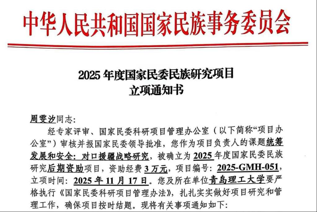 刘金德副教授主持申报的《清代东北地区族际通婚与中华民族交往交流交融研究》,获批民族研究项目公开招标青年项目;周雯汐博士主持申报的《统筹发展和安全:对口援疆战略研究》,获批民族研究项目后期资助一般课题。